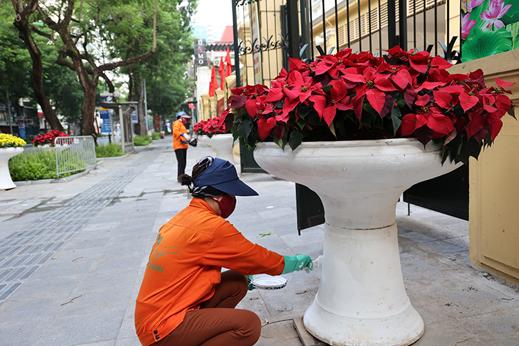Chậu cây cảnh rực rỡ trang trí ngoài cổng trường trước ngày khai giảng đặc biệt.