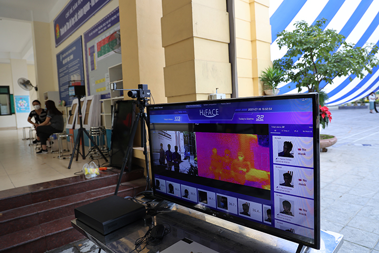 Máy đo nhiệt độ thông minh tự động kiểm tra nhiệt độ tất cả các đại biểu và học sinh trước khi vào tham dự Lễ Khai giảng.