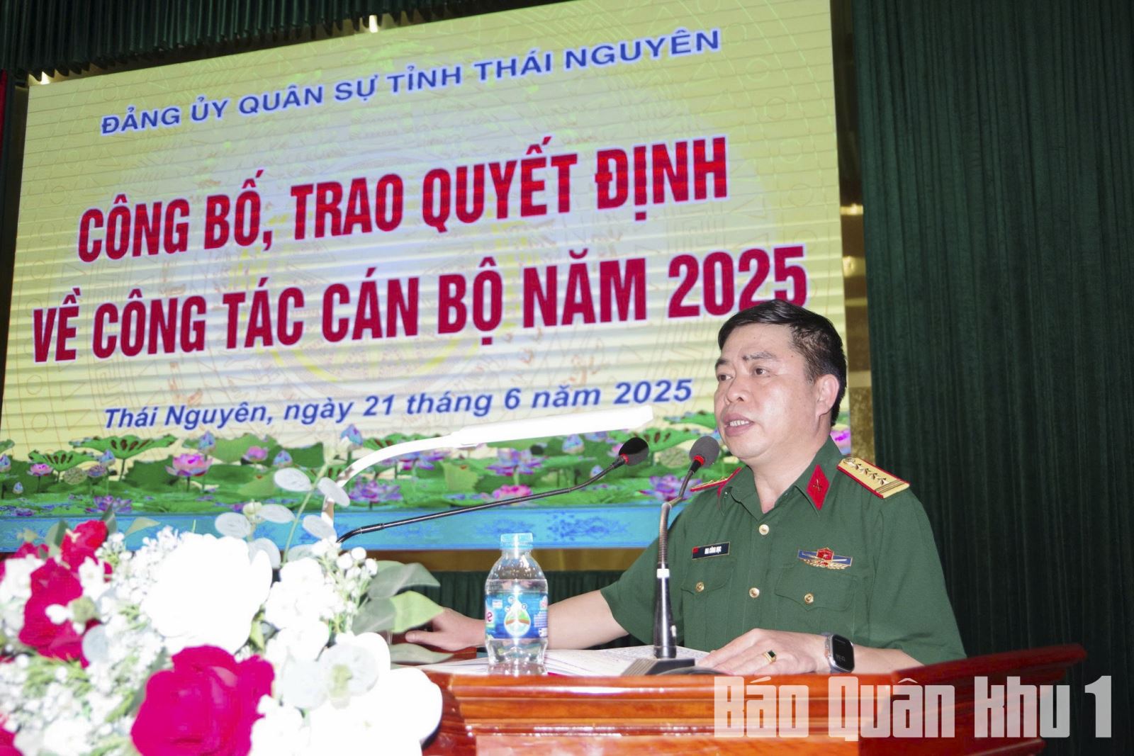 Đại tá Ma Công Học, Tỉnh ủy viên, Phó bí thư Đảng ủy, Chính ủy Bộ CHQS tỉnh Thái Nguyên phát biểu tại hội nghị công bố Quyết định công tác cán bộ năm 2025. Ảnh: Duy Đức