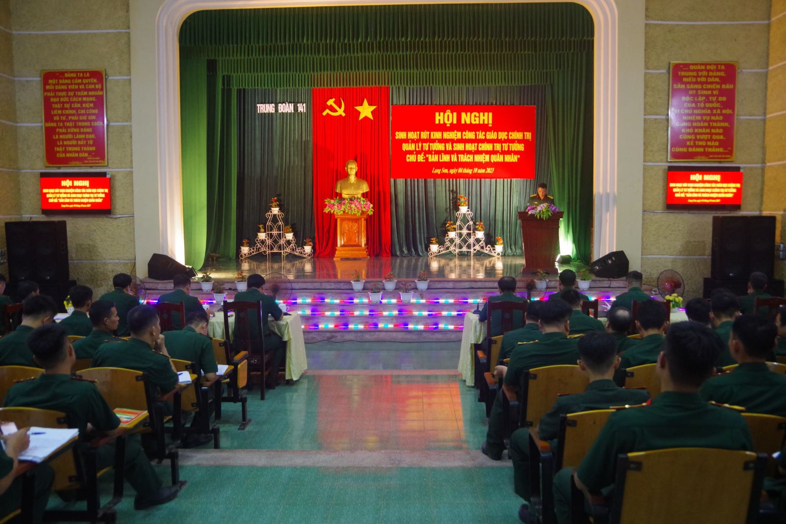 Tối ngày 04/10/2023, Trung đoàn 141 (Sư đoàn 3) tổ chức Hội nghị sinh hoạt rút kinh nghiệm công tác giáo dục chính trị quản lý tư tưởng và sinh hoạt chính trị tư tưởng với chủ đề “Bản lĩnh và trách nhiệm quân nhân”. Dự và chỉ đạo có Thượng tá Hoàng Quốc Tuấn, Ủy viên Ban Thường vụ Đảng ủy, Phó Chính ủy Sư đoàn; Trung tá Dương Xuân Giang, Bí thư Đảng ủy, Chính ủy Trung đoàn chủ trì hội nghị.