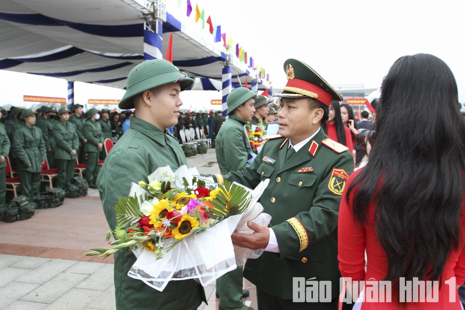 Thiếu tướng Ngô Hồng Thái, Phó Chủ nhiệm Chính trị Quân khu tặng hoa chúc mừng động viên thanh niên lên đường nhập ngũ.