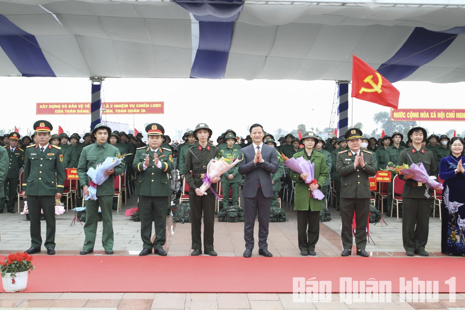 Thiếu tướng Ngô Hồng Thái, Phó Chủ nhiệm Chính trị Quân khu cùng lãnh đạo UBND tỉnh và Công an tỉnh Thái Nguyên tặng hoa động viên thanh niên lên đường nhập ngũ.